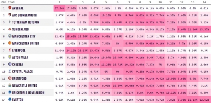 Opta超级计算机的最新预测结果显示,阿森纳目前有67.34%的概率夺得英超冠军,曼城和利物浦尽管跌出前四,但仍然是第二和第三大热门,两队的夺冠概率分别为12.43%和11.04%。